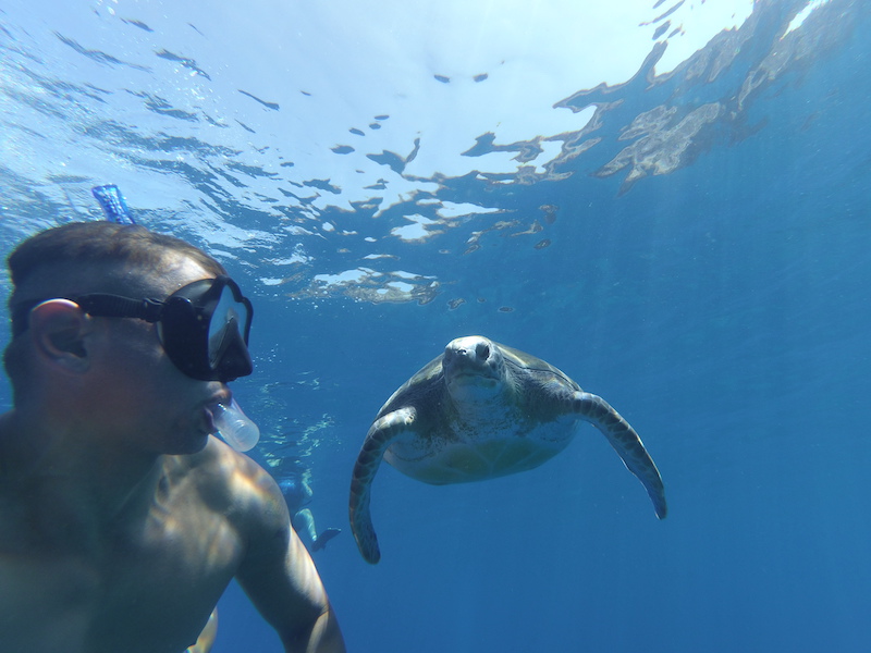 Maar je kunt het kajakken ook achterwegen laten en alleen snorkelen met schildpadden.