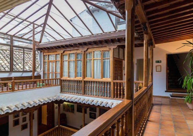 Het kleine hotel heeft een gezellige Andalusische binnenplaats met houten galerij.